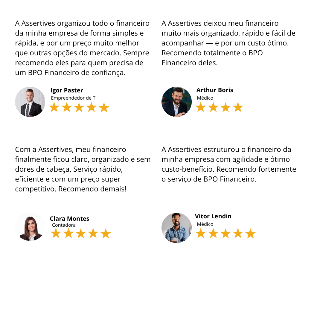 Ainda em dúvida se o nosso BPO Financeiro realmente entrega o que promete? A melhor forma de confirmar é ouvindo quem já trabalha com a gente. Empresas de vários segmentos ganharam mais organização, controle e tranquilidade ao terceirizar o financeiro conosco.